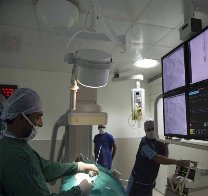 Angioplasty (or Balloon angioplasty) is an endovascular procedure to widen narrowed or obstructed arteries or veins, typically to treat arterial atherosclerosis. An empty, collapsed balloon, known as a balloon catheter, is passed over a wire into the narrowed locations and then inflated to a fixed size. The balloon forces expansion of the stenosis (narrowing) within the vessel and the surrounding muscular wall, opening up the blood vessel for improved flow, and the balloon is then deflated and withdrawn. A stent may or may not be inserted at the time of ballooning to ensure the vessel remains open.